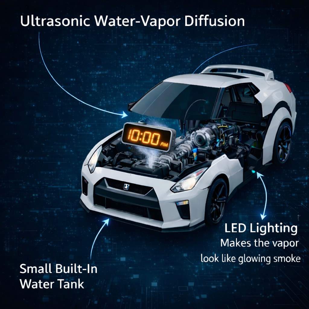 The flame-style exhaust visuals work using ultrasonic water-vapor diffusion, not real heat or smoke: